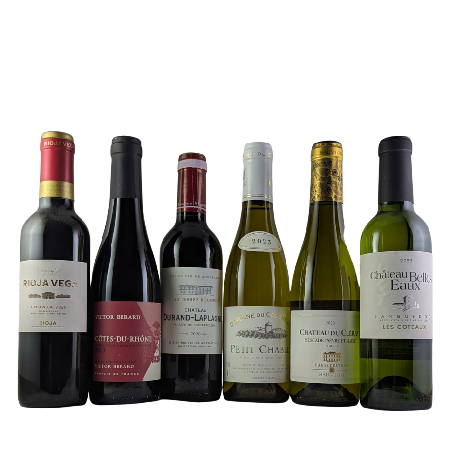 A mixed case of 6 different half bottles of red and white wines. A perfect gift for a wine lover home alone.